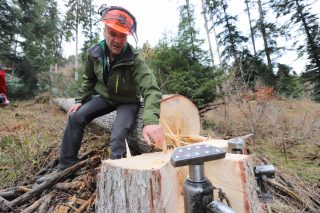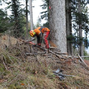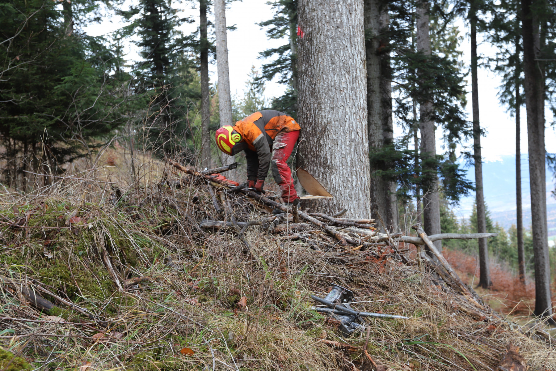 Bild: Hoch konzentriet bereitet der frisch gelernte Forstwart, Ivo Arpagaus die Fallkerbe für eine der gross gewachsenen Weisstannen im Schutzwald Raum Känzeli oberhalb der Stadt Chur vor.