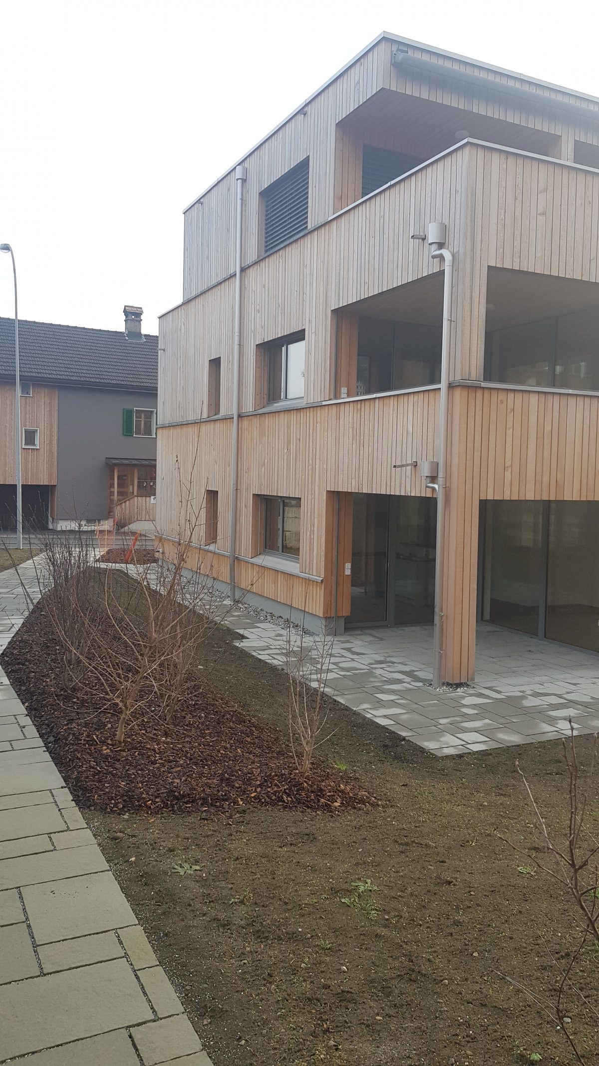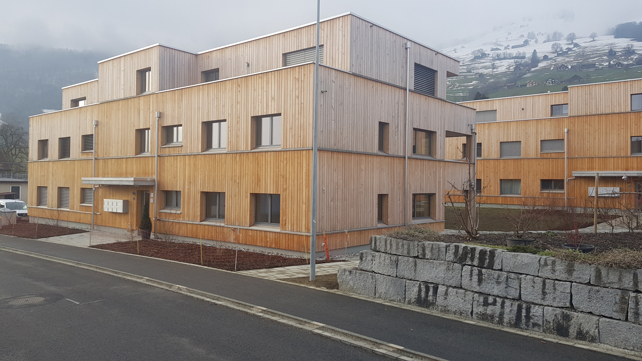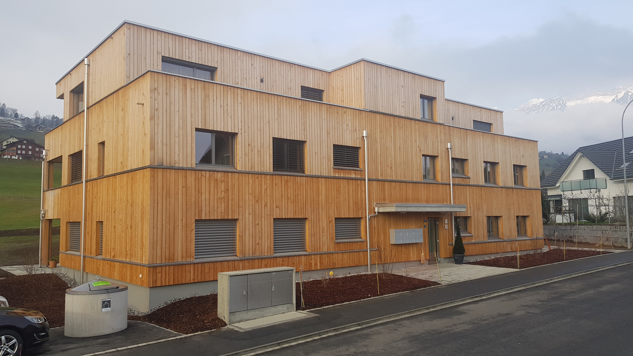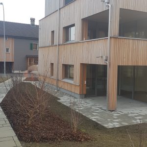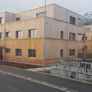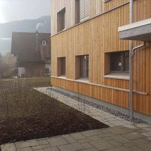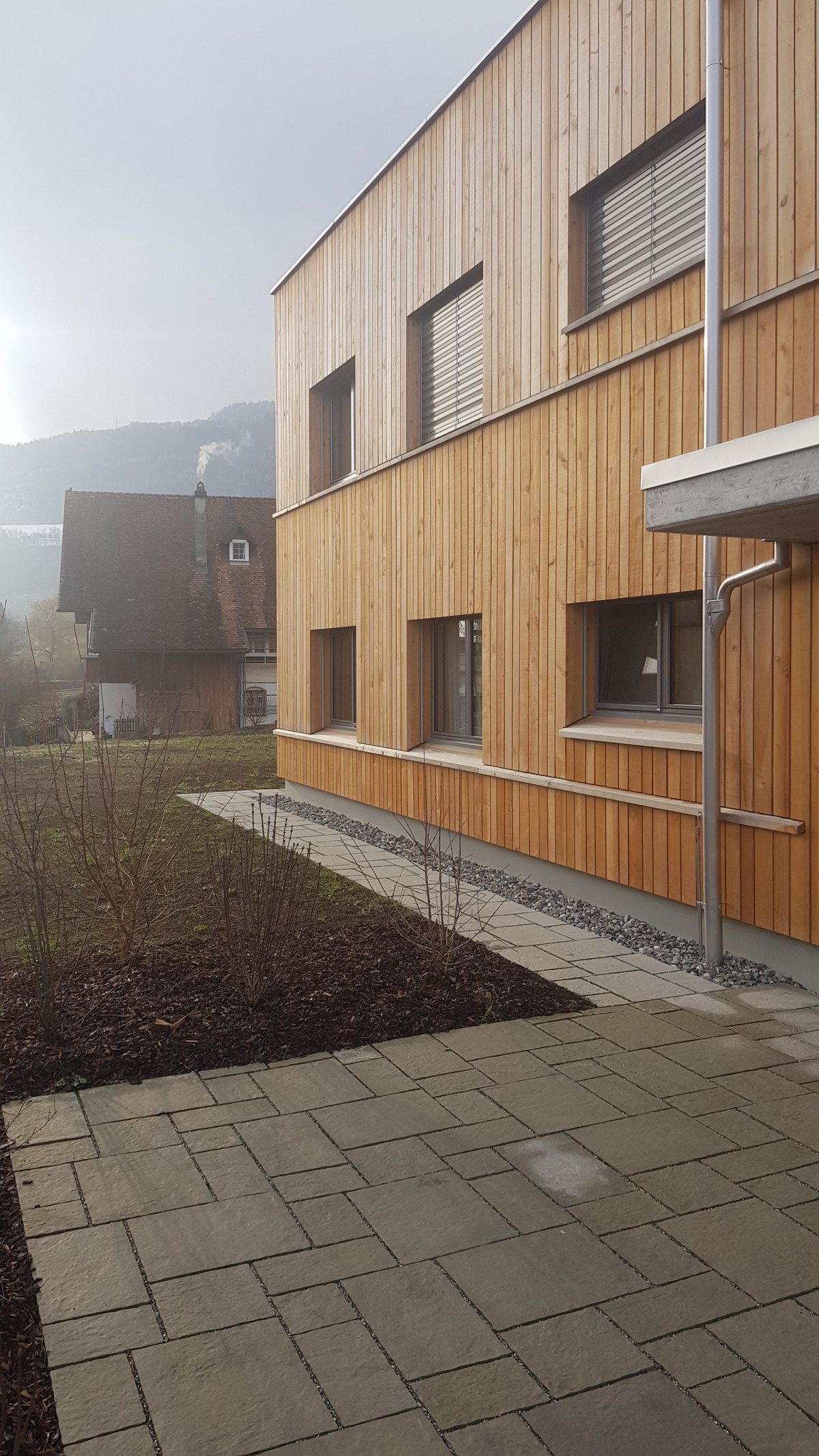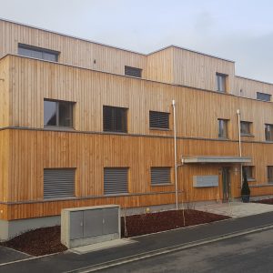 Die Fassade der zwei Mehrfamilienhäuser „IMMONDHOLZ“ wurde aus Douglasienholz aus dem Gemeindeeingenen Waldungen gefertigt.